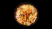 Оризови спагети, мариновано пилешко, фъстъци, яйца от свободно отглеждани кокошки,кълнове ,пресен лук, лайм и нашия Пад Тай сос