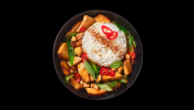 Мариновано пилешко, тайландски босилек, печено кашу,прясно чили, щипка подправки, поднесено със задушен ориз